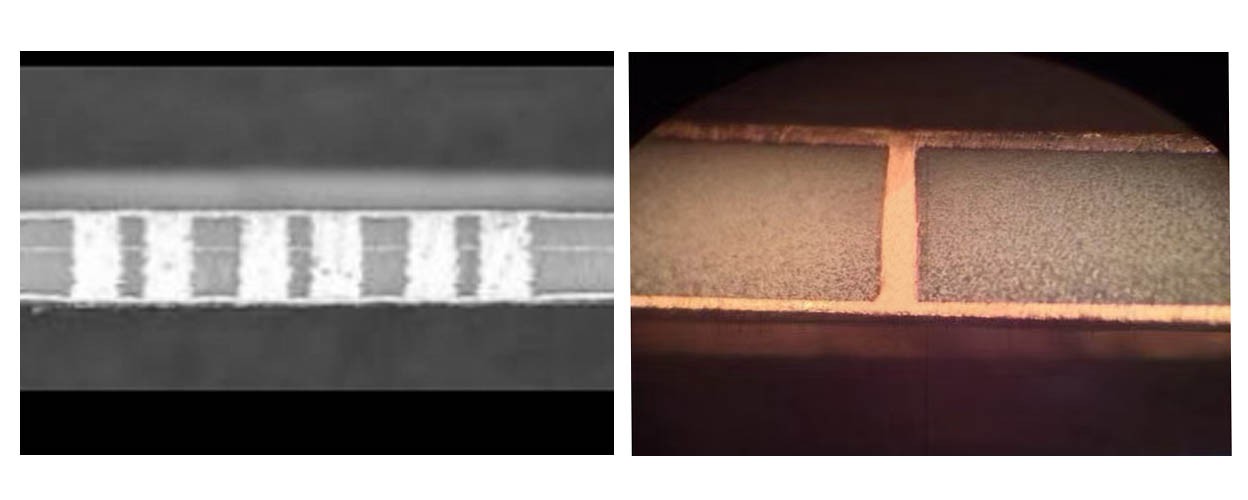 左图为陶瓷腔体的LTCC陶瓷基板截面图,右图为DPC(直接镀铜)陶瓷基板截面图
