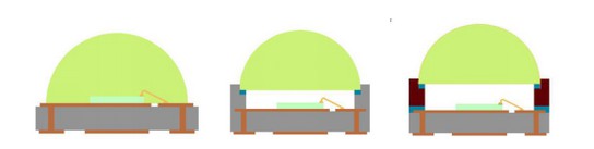 这种设计笔者认为存在一些缺陷,比如玻璃透镜形状复杂,制作成本高;玻璃透镜与基板之间采用有机粘合,容易脱落,降低了可靠性;玻璃透镜与基板粘合时对位精度要求高,增加了封装设备成本。