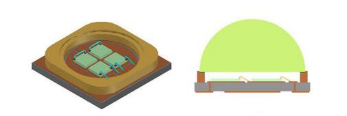 采用3D成型DPC陶瓷基板则可以克服以上缺陷,如图7(b)所示,该技术可以在陶瓷基体上一体成型出带有散热口的金属围坝,封装时不存在围坝与陶瓷基板对位偏移的风险,围坝顶部制作有限位台阶,便于玻璃透镜的定位。