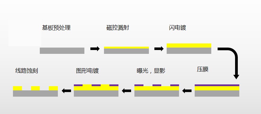 薄膜法作为一种晶片级制造技术,是微电子制造中金属薄膜沉积的主要方法:首先在金属化之前,应按照一定的要求将已烧结好的瓷片进行相关处理,以达到周边无毛刺、无凸起,瓷片光滑、洁净。然后再通过磁控溅射,在陶瓷表面沉积一层薄薄的Cu层作为种子层,以便后续的电镀工艺开展。然后进行闪电镀来给种子铜增厚(保护种子铜)。再然后通过贴膜、曝光、显影等工序完成图形转移,再电镀使Cu层增长到所需厚度,最终通过退膜、蚀刻工序完成导电线路的制作。